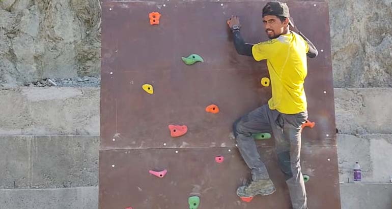 A climbing wall is an artificially constructed wall with grips for hands and feet, usually used for indoor climbing, but sometimes located outdoors. Some are brick or wooden constructions, the material most often used is a thick multiplex board with holes drilled into it. Recently, manufactured steel and aluminum have also been used. The wall may have places to attach belay ropes, but may also be used to practice lead climbing or bouldering.